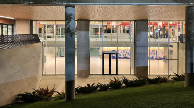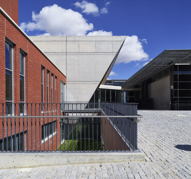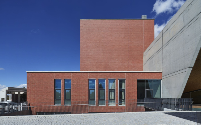 Чтобы не нарушать сложившуюся картину, обращенный на эту «улицу» фасад с главным входом для публики сделан сравнительно скромным, с рядом опор понизу и ламелями на остекленной полосе сверху. С противоположной стороны вид здания определяет техническая часть с колосниками: она полностью облицована красным кирпичом.