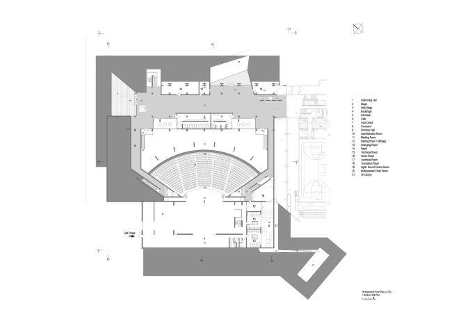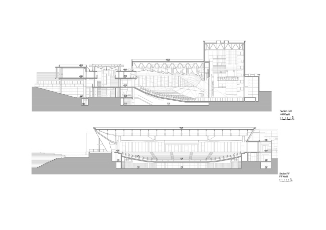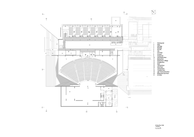Зрительный зал спланирован по демократичной схеме античного театра, и при необходимости его можно разделить на несколько меньших. Энергичные грани, на которые поделены стены, напоминают решение боковых фасадов.