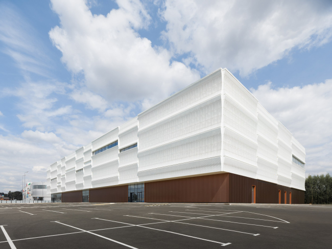 Простой, но динамичный объем сочетает легкость верхней части и лаконичность основания, облицованного панелями медного оттенка. Динамика достигается за счет объемных модулей, собранных из перфорированных металлических панелей. Стекло используется там, где важно раскрыть виды и впустить в помещения естественный свет – у входных групп, в зоне фудкорта, а также в лифтовых холлах. Комплекс аккуратно вписывается в сложившуюся среду района, выделяется на фоне окружающей застройки, при этом с ней не спорит.