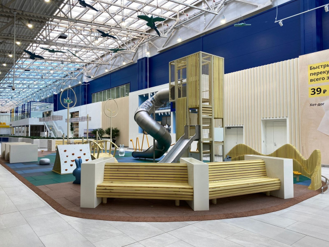 Игровые комплексы из эко-линейки «Новых горизонтов» можно адаптировать и для помещений. Свежий пример – трехъярусная башня с двумя горками, установленная в петербургском ТРЦ «Мега Парнас». Дизайнеры и конструкторы «Новых Горизонтов» использовали для каркаса сталь, окрашенную под дерево, для внешних панелей – древесину хвойных пород, для горки – нержавеющую 3-мм сталь. Поскольку предполагалось интенсивное использование, для адаптации был выбран уличный игровой комплекс с изначально повышенной износостойкостью.