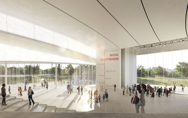 Собственно здание площадью около 20 000 м2 будет лишено парадного фасада. Все его четыре части (симфонический зал на 1600 мест, репетиционный зал на 250 зрителей, «творческий хаб» и зал с подиумной сценой) расположатся крестообразно вокруг крытого общественного пространства. Под ним разместят общие подсобные и технические помещения четырех залов.