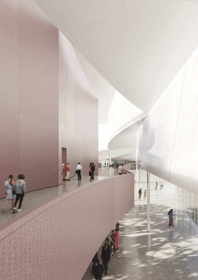 Перекрытия напоминают драпировки занавеса, а фактура фасадов – рябь на глади Дуная. Проект также включает новую площадь, где можно проводить концерты, учебные студии, архив для оркестра, ресторан с джазовым клубом.Концертный зал Белградской Филармонии© AL_A