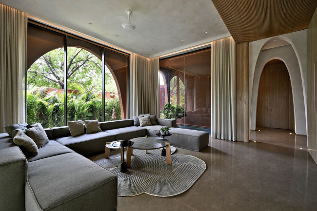 «Дом арок Мирай» (920 м2) расположен в городе Бхилвара, где температура выше 40 градусов по Цельсию может наблюдаться большую часть года. Поэтому крайне важным было охладить интерьер пассивными средствами, что позволило бы сэкономить ресурсы.