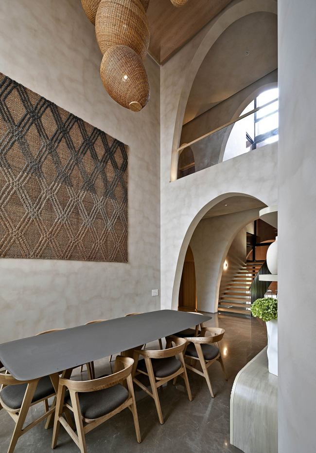 На трех этажах виллы живет семья из трех поколений. Здесь есть четыре спальни (одноуровневые, примерно одинаковой площади), двухсветная столовая и две общие комнаты / гостиные «полуторной» высоты.