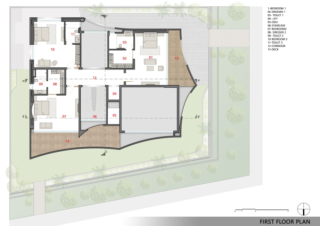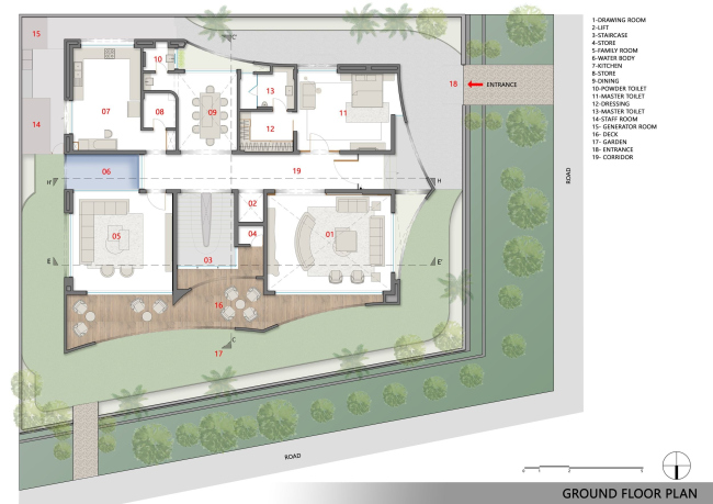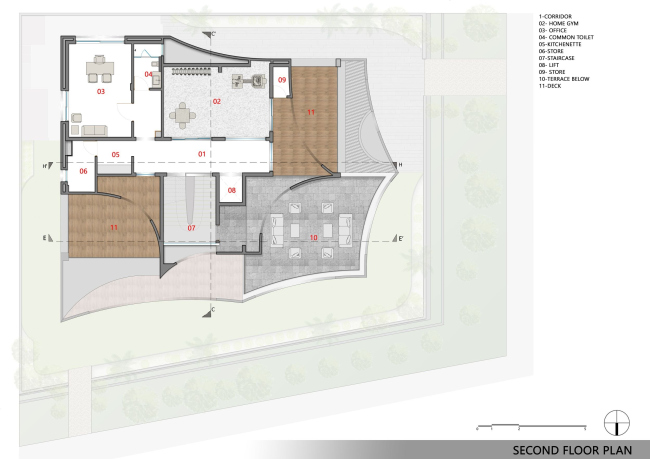 Северный и западный фасады выходят на тихую улицу, от которой они закрыты зеленью. Обширные арочные проемы и устроенные под ними террасы обеспечивают затенение интерьера, при этом пропуская внутрь достаточно непрямого солнечного света.