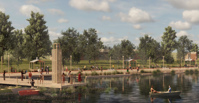 Свой проект авторы называют «город-лес» по созвучию с городом-садом, сосредотачиваются на идеях развития речного и зеленого каркаса, выявляют значимые места вдоль рек и предлагают дополнить новыми посадками озеленение – и без того зеленой, казалось бы, территории, – чтобы создать цельные и качественные природные маршруты. Акцент сделан на связности, которая, согласно замыслу, должна проявить себя через наложение разных «сеток».