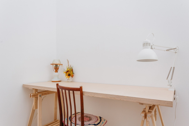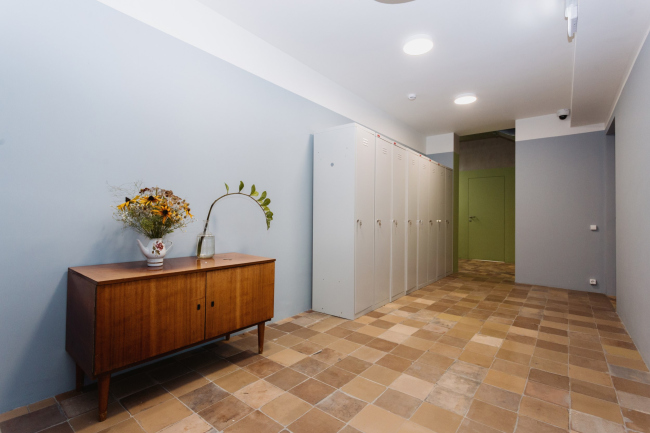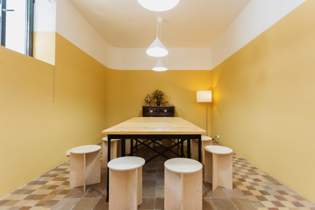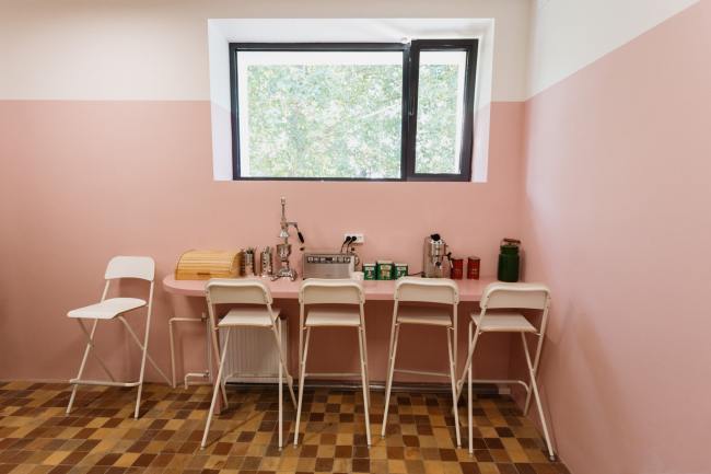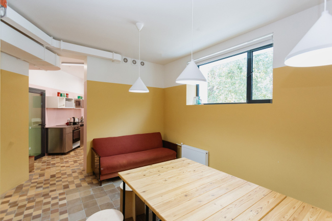 Авторы реконструкции, по их словам, стремились сохранить в здании зонирование и атрибутику кафе советского кафе – так, в помещениях, где будут жить художники, на стенах появилась характерная масляная краска довольно-таки ярких оттенков.