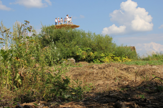 Объект «Безвесье». Древолюция 2022Фотография: Юлия Тарабарина, Архи.руОбъект «Безвесье». Древолюция 2022Фотография: Юлия Тарабарина, Архи.ру «Беседка» стоит на берегу пруда, на возвышении примерно в 2 метра от уровня земли вокруг. Ее собственная высота 8 м, так что поднявшись на платформу мы оказываемся на 10 метров выше. В объекте 3 яруса, и верхний авторы, по их словам сознательно, сделали прочным, но таким, чтобы он пошатывался несколько сильнее, чем нижние, провоцируя присесть или прилечь и смотреть в небо. Растительность, тщательно выполотую везде вокруг, на холме «Безвесья» сохранили – даже борщевик, в котором проявилась скульптурная пластика.