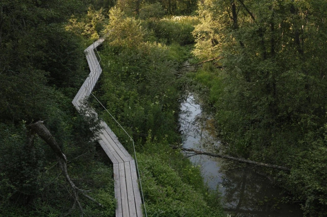 Вторая картинка отлично иллюстрирует образ парка-леса на склоне реки, пронизанного деревянными тропинками: они то складываются в строгие и прямые линии кардо и декумануса, которых, впрочем, не минуют поваленные и нарочно оставленные деревья, то изгибаются как окольные тропы. Надо сказать, что и второй вид, тоже из башни, и тоже исторический. Понятно, что один из основных месседжей пространства, созданного Бродским, – транзиторность рукотворной среды, которая уходит в прошлое на наших глазах, сереет, прорастает и разлагается. Это одна из основных тем архитектора. Но никто ведь не думал, что парк будет исчезать так быстро. Ощущение такое, что мы одновременно чествуем парк и с ним прощаемся – будем надеяться, что оно ложное.