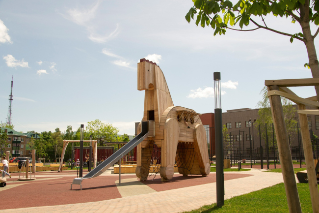 Однако главное все же в том, что парк Веретьево – совершенно необходимый объект для награждения, украшение любой премии. Его уже даже за границей наградили, и вот, в Новосибирске Золотая капитель 2022 его отметила как лидера рейтинга. Бывают такие произведения, которые каждая премия стремиться успеть наградить – они дают определенные очки значимости. Это как с людьми: одни стремятся попасть на праздник, а других – отдельная задача зазвать и заполучить. Объект был подан на премию заказчиками, усадьбой Веретьево. Александр Бродский на награждение не пришел. Специальный приз жюриТроянский конь / Пенза / ЖК «Фаворит» Архитектурное бюро «Вещь!»
