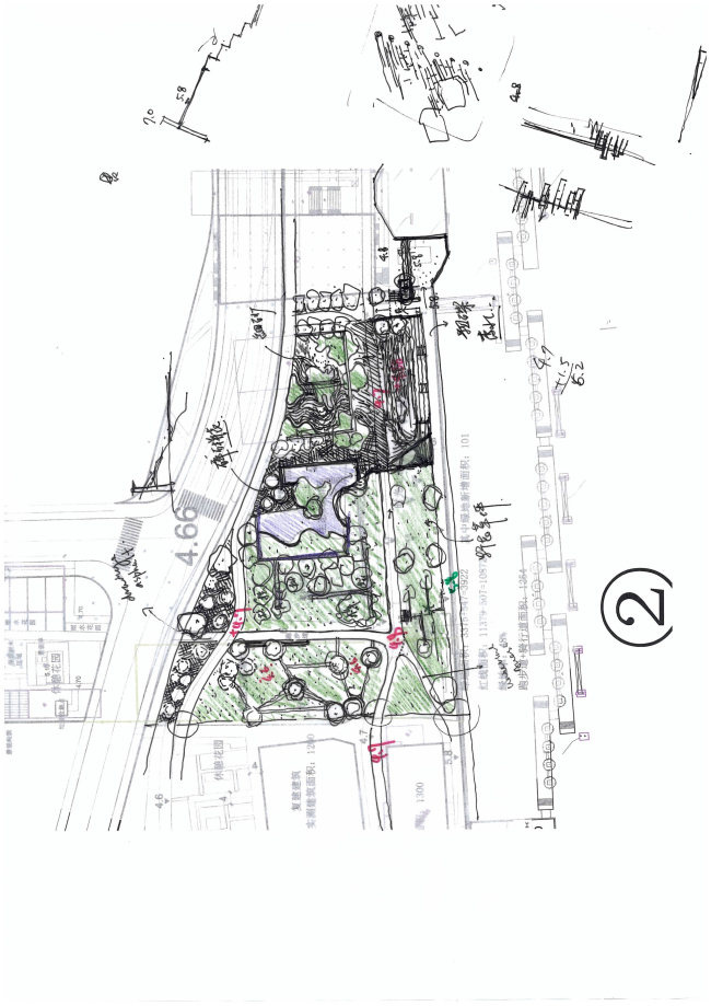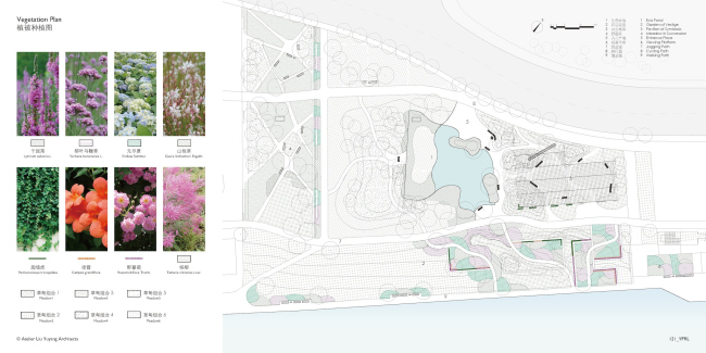 Растущие на территории камфарные деревья сохранили, проложили пешеходные и велосипедные дорожки, в том числе по кромке набережной Янпу, и создали несколько точек притяжения, при помощи которых архитекторы, по их собственному выражению, сформировали «скелет» всей территории. В качестве основных материалов использовали крупнопористый бетон, гранитную крошку, бетонные блоки, желтый ракушечник и стальные пластины с фторуглеродным покрытием.