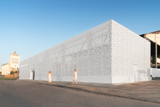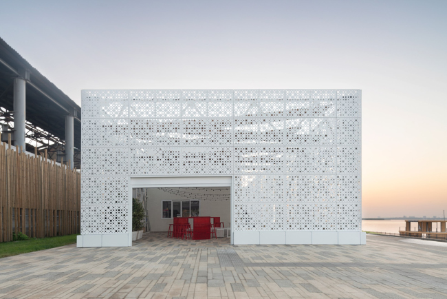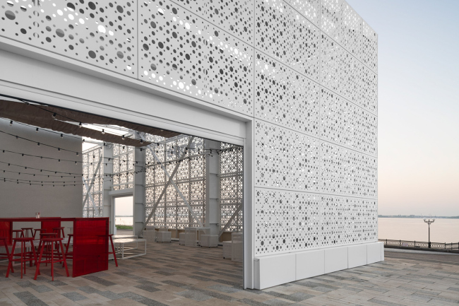 Павильон для кинопоказов и фестивалей на набережной Саратова: ажурные стены, пропускающие речной простор, и каннская атмосфера внутри.