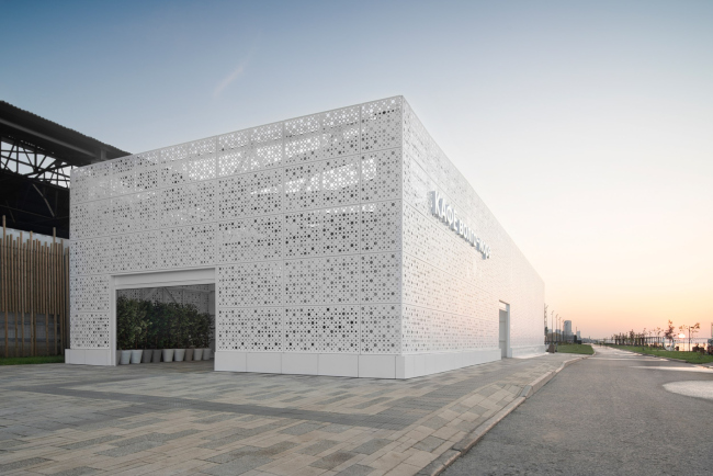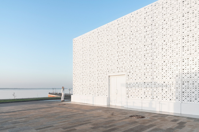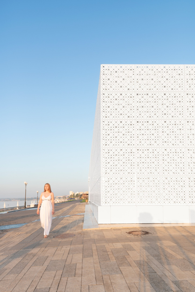 Параллелепипед павильона кинотеатра – узел линейного пространства на пересечении двух градостроительных осей: уходящей за горизонт прогулочной зоны набережной и улицы Шелковичной, соединяющей берег с городом. Простые формы объекта не случайны: они не перегружают среду, фокусируясь на главном – функциональном наполнение павильона.