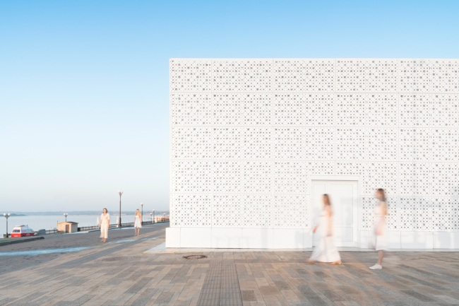 Продумывая оформление павильона авторы стремились добиться легкости, чистоты и ощущения воздуха внутри пространства. Светлые материалы фасада и текстура натурального дерева в отделке ступеней амфитеатра создают настроение лета в курортном городе. Проницаемый фасад из перфорированных панелей дает возможность заглянуть внутрь объекта, не отделяя его от пространства набережной. Павильон – это ширма, где гуляет ветер и куда проникает солнечный свет. Это оболочка открытого городского пространства.
