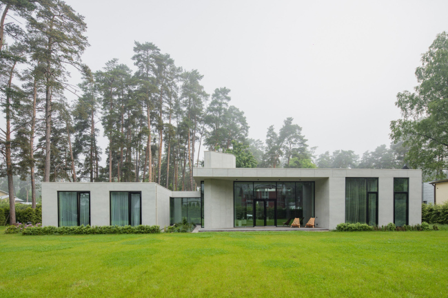 Одноэтажный дом для шести человек изначально хотели отделать камнем. Но администрация курортной Юрмалы, известной не только старинными деревянными домами с резным декором, но и модернистской архитектурой, не утвердила такое решение. Поэтому авторы проекта обратились к архитектурному бетону.