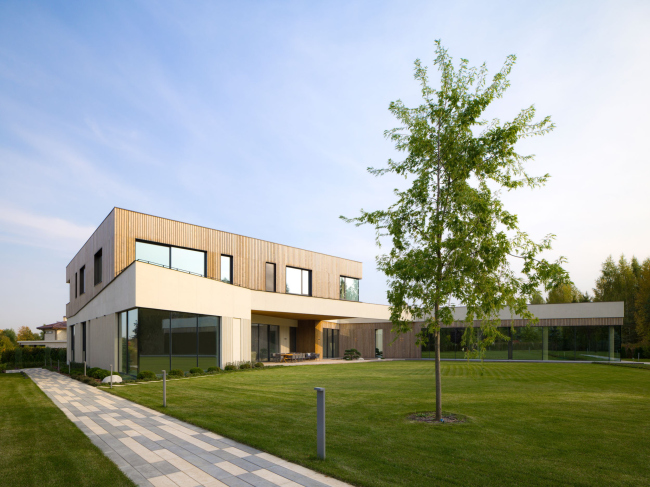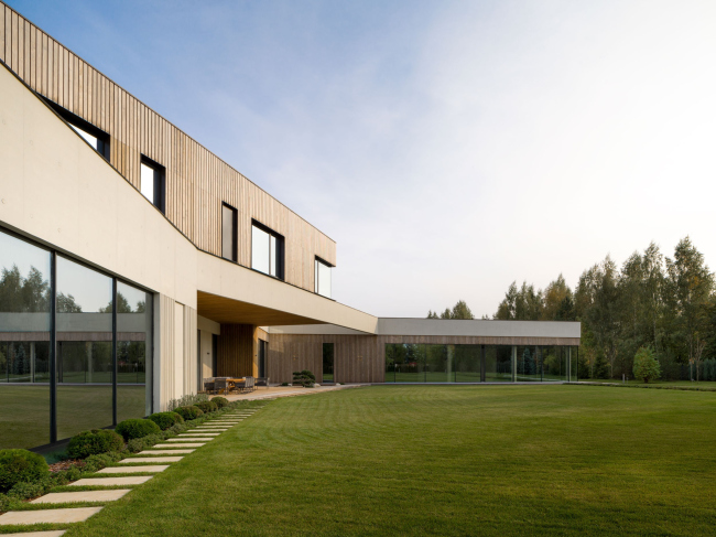 Дом в подмосковном поселке «Миллениум парк» расположен на участке трапециевидной формы. Одной из задач было отгородиться скульптурным объемом от дороги, ориентировав повседневную жизнь обитателей дома в сторону рощи и ручья. Это определило сложную, ломанную геометрию первого этажа, в котором сосредоточены общественные пространства, зона SPA и бассейн. На контрасте верхний этаж, где расположены спальни и гардеробные, получил простую и ясную геометрическую форму.
