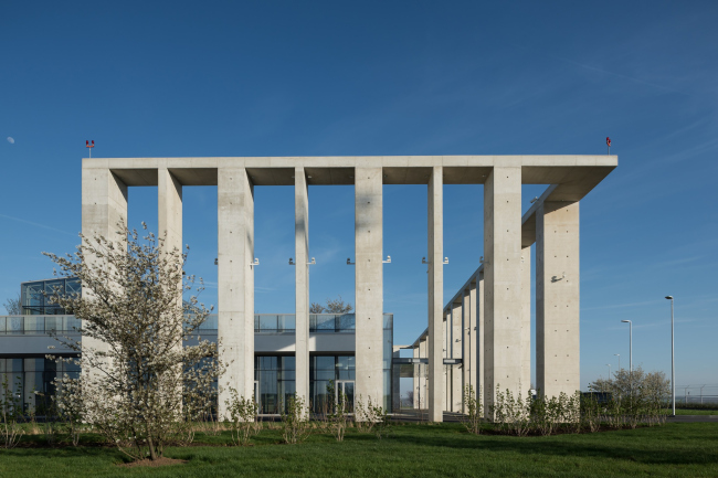 «Наос», то есть сам терминал, – воздушный стеклянный объем с внутренним двором-оазисом. Необходимую для своей VIP-функции статусность здание приобретает за счет окружающей его пилонады из монолитного бетона – она не служит опорой для кровли, не защищает от дождя или солнца, ее главная задача – репрезентативная. Нерегулярный ритм, чередование толстых и тонких опор, открытые углы и пауза-разрыв со стороны лётного поля сообщает структуре оттенок романтической незавершенности, свойственный руинам античных городов, в то время как масштаб заставляет искать сходство, скорее, с мегалитическими сооружениями.