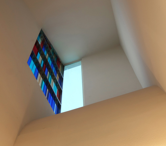 В результате, из читального зала все же открывается вид с охватом 270 градусов. Непривлекательные перспективы загораживает ведущая к библиотеке высокая стена: вдоль нее проходит один из входных маршрутов. Второй – извилистая тропа между валунов, вверх по склону холма: она символизирует непростой путь к знаниям.