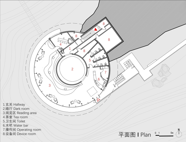 Водоем на кровле превращает библиотеку в «подводную», архитекторы продолжают эту метафору: посетители как будто ныряют туда за книгами. В интерьере есть внутреннее затененное помещение, где можно настроиться на чтение, внешний зал с панорамными окнами, а еще – VIP-комната для чайных церемоний.Библиотека «Капля воды»Фото © Jin Weiqi