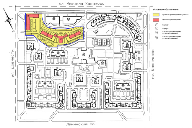 Будущий жилой комплекс расположится недалеко от легендарного рынка «Юнона», в 18-м квартале Юго-Запада, на углу улиц Маршала Казакова и Доблести. Квартал почти полностью застроен в соответствии с ППТ, утвержденным в 2005 году, в рамках которого действовали и архитекторы «Проекс». Оставшийся свободным участок должен был, очевидно, стать продолжением соседних ЖК «Балтийская волна» и «Южный» с полукруглыми секциями. От их планировочной структуры остались два многоэтажных паркинга на первой линии перед улицей Маршала Казакова. «Проекс», однако, решил идти своим путем.