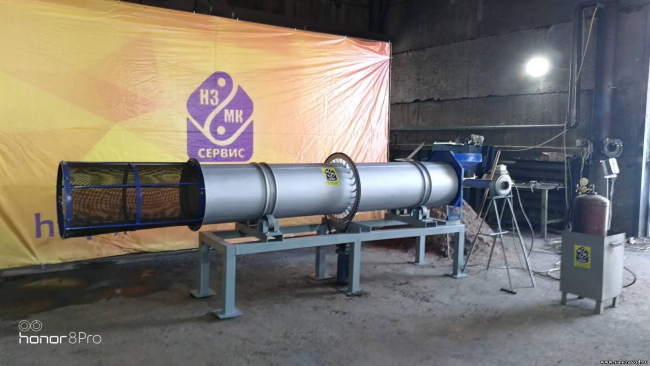 Работа установки направлена на обдувание и нагревание влажного сыпучего сырья, в результате чего происходит испарение влаги, которая удаляется через открытый торец цилиндра вместе с отработанным воздухом, а готовая сухая смесь используется по назначению.