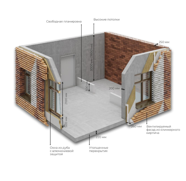 За повышенную энергоэффективность в жилых корпусах отвечают не кирпичные стены, а “пирог” вентилируемого фасада: в NEVA HAUS толщина конструкции внешних стен составляет 460 мм: 200 мм – монолитная стена, 260 мм – утеплитель и облицовка клинкерным кирпичом. Благодаря разработанной системе NEVA HAUS стал первым элитным жилым комплексом в Санкт-Петербурге, официально получившим статус энергоэффективного, водоэффективного и экологичного объекта по системе GREEN ZOOM.