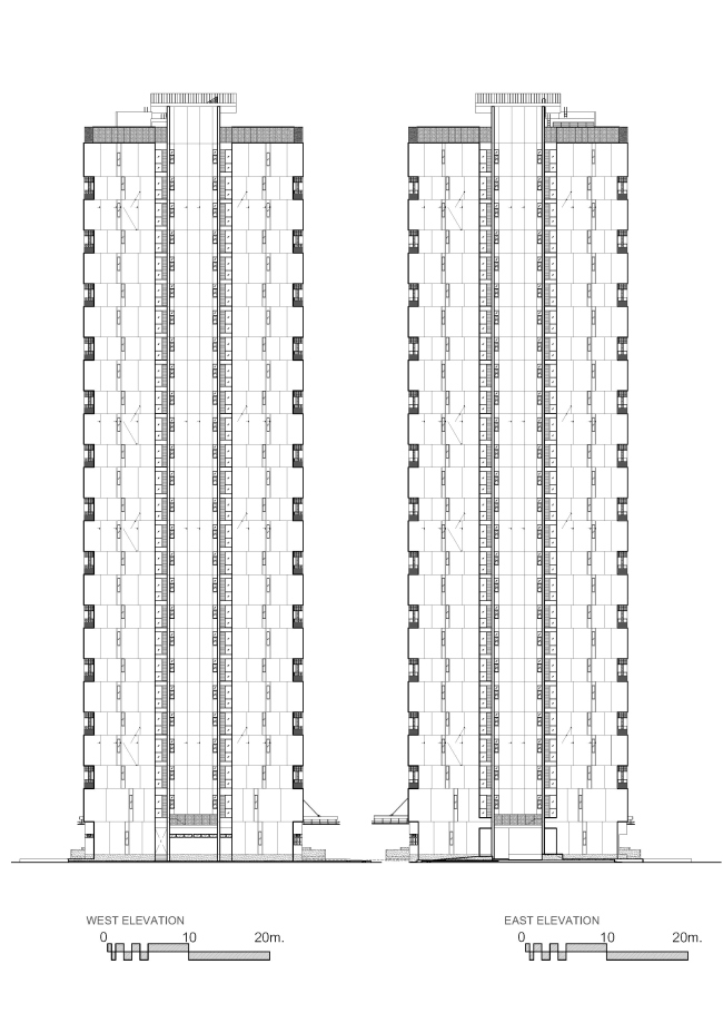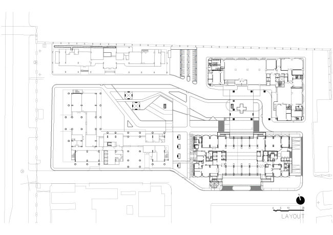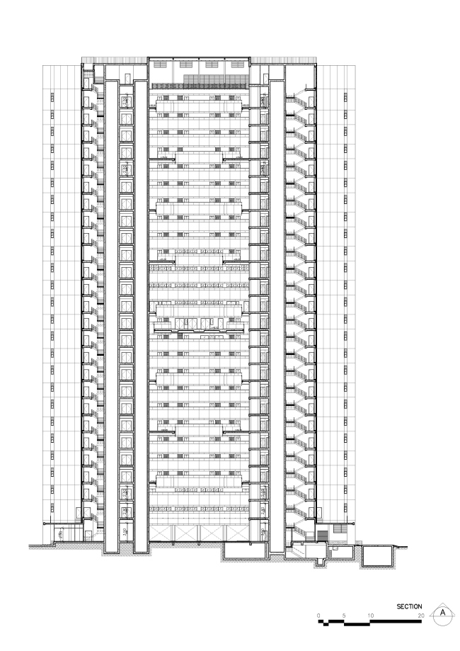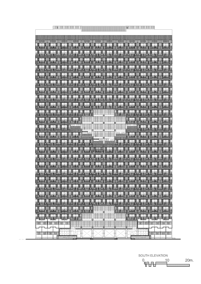 Новое 26-этажное здание таким образом позволило закрыть периметр, связав все корпуса и образовав внутреннее безопасное пространство для жильцов. Его первый, проницаемый этаж служит воротами в этот двор (вход даже дополнительно выделен цветом) и обеспечивает связь с окружающим городом и территорией госпиталя.