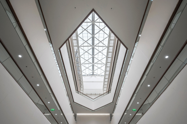 В результате возникли две самостоятельные жилые пластины, каждая со своим коридором и рядом комнат с внешней стороны. Между собой они соединены свободным пространством, в котором размещены все коммуникации и атриум. Оно и выполняет роль вытяжной трубы, отводящей застоявшийся воздух через крышу, а также позволяет доставить естественный свет во внутренние зоны. Дополнительно в систему естественной вентиляции включен неожиданный проем в центральной части полностью белого фасада, обнажающий конструкции, отделка которых имитирует темное дерево. В его напоминающей бриллиантовую огранку форме обыгран логотип Общества Красного Креста Таиланда, которое управляет госпиталем.