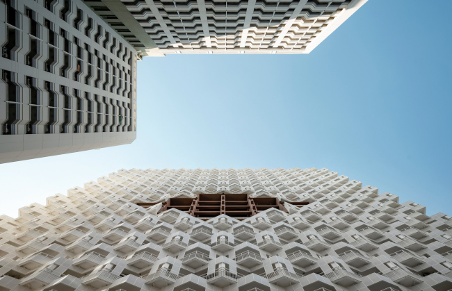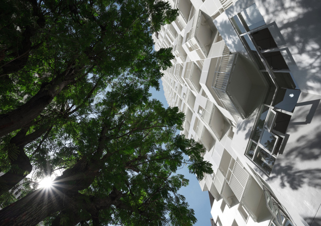 Из-за слишком близкого расположения соседних зданий небольшие балконы развернуты под углом, формируя зигзагообразную, немного эшеровскую поверхность объемного фасада. Решетки из выкрашенного в белый цвет алюминия дополнительно защищают от перегрева и лишних взглядов, создавая комфортное пространство для растений и одновременно скрывая все бытовые детали вроде сохнущего белья, выносного блока кондиционера и стиральной машины. Кроме этого, в общежитии работают библиотека, столовая, отдельная прачечная и предусмотрены различные зоны коммуникации и совместного времяпрепровождения.Сестринское общежитие при Мемориальном госпитале короля Чулалонгкорна в БангкокеФотография © Panoramic Studio / предоставлена Plan Architect