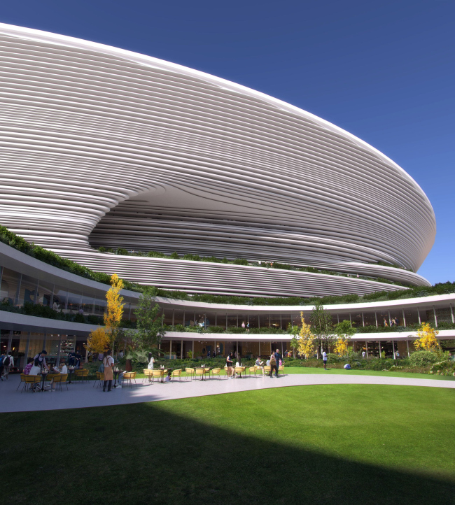 Формальной темой проекта стала слоистость. Она наиболее проявлена в объеме стадиона, который выглядит благодаря ей то прозрачным, то монолитным. Так же решен и подиум (площадь 45 тыс. м2), на котором стоят все три сооружения. В нем размещены их общие «мощности»: пространства для тренировок и спортзалы, раздевалки и административные помещения, а также выходящие во дворы и на террасы кафе, рестораны и магазины.Международный спортивный центр в Ханчжоу© Plomp