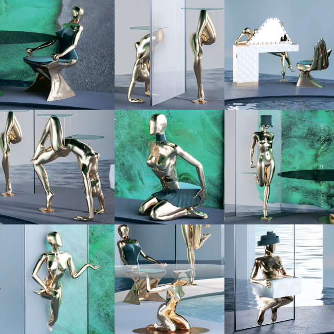 Коллекция фигур состоит из 9-ти предметов мебели, каждый из которых передаёт состояние и чувственное настроение, присущее настоящей и счастливой женщине. Позы, изгибы наполняют окружающее пространство успокаивающей или, наоборот, побуждающей энергией. Утончённость и грация, красота и откровение, эстетика и искусство навсегда поселятся в сердцах обладателей. Сложность исполнения каждой скульптуры, высокий процент ручного труда превращают мебель в уникальный арт-образец!