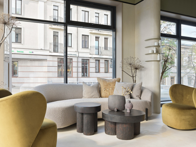 Рузанна Аветисян стремилась создать проект вне трендов и вне времени, при этом впечатляющий, но не отпугивающий своим шиком. Поэтому выбор пал на природную тематику, естественные приглушенные цвета, натуральные материалы и мягкие фактуры. Линии интерьера «обнимают» посетителя и говорят: «конечно можно!»