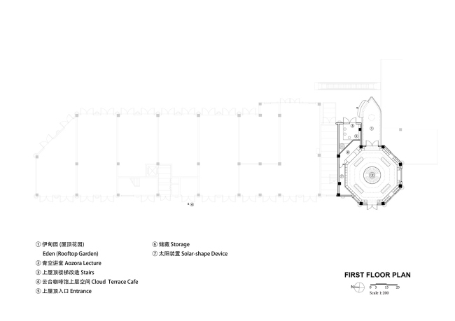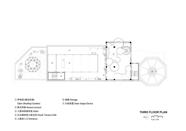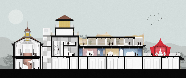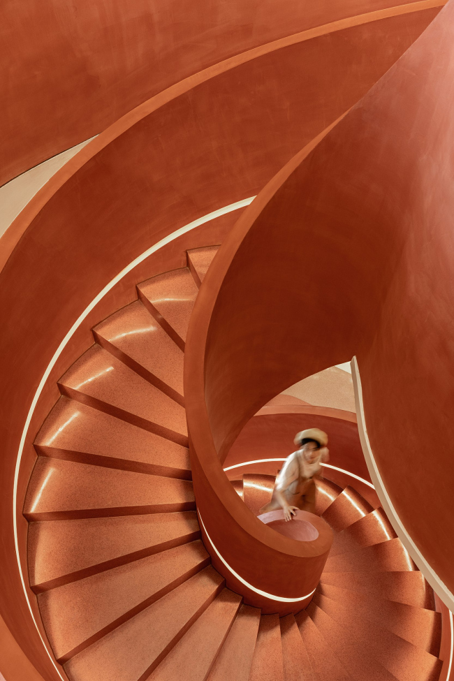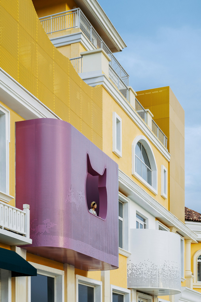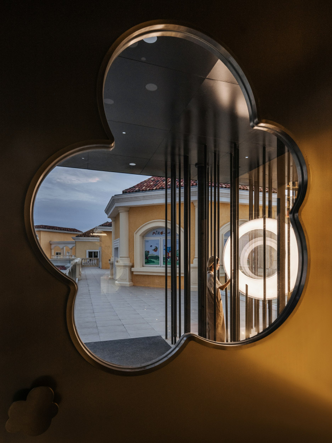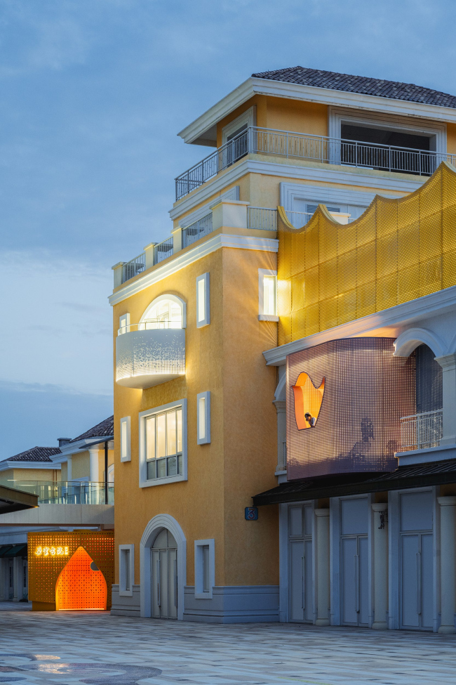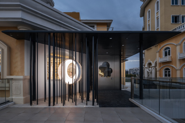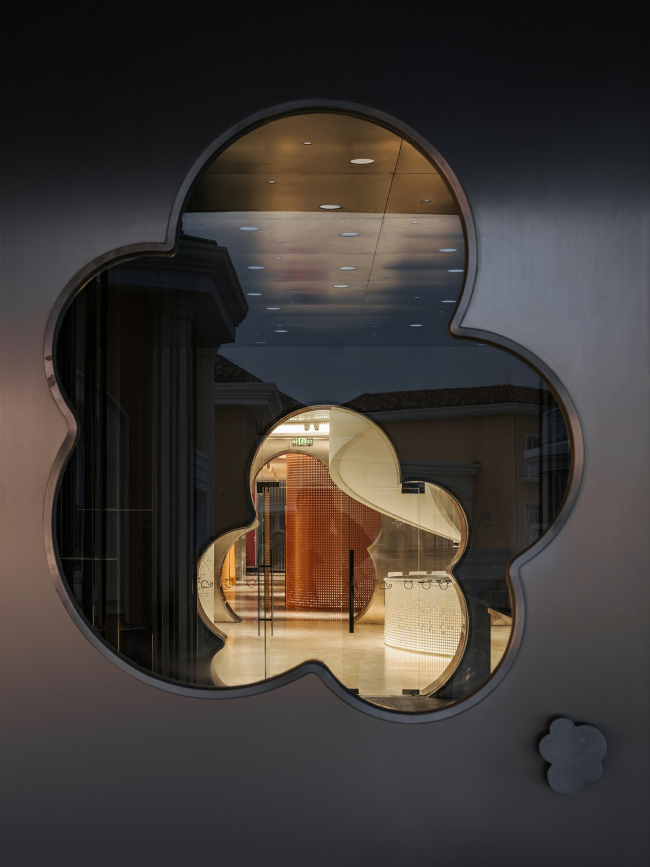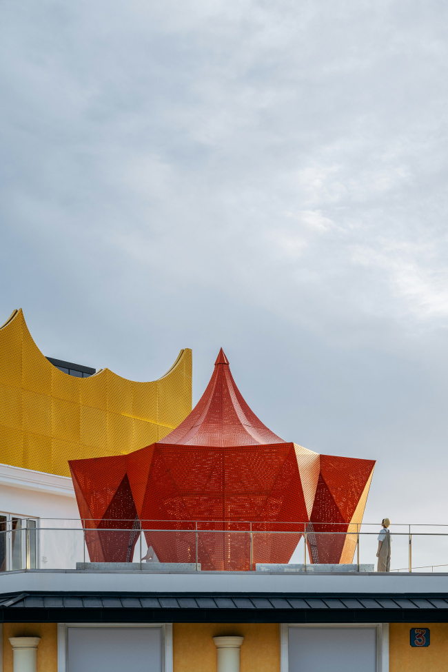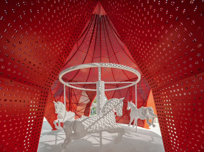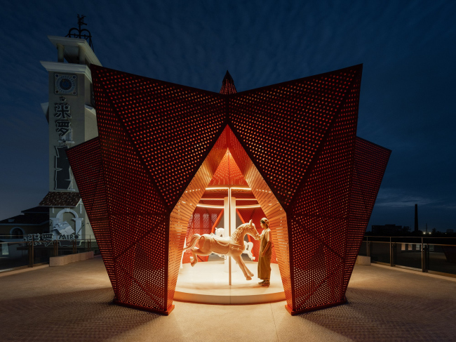 Главный вход находится в южной части магазина: чтобы попасть внутрь, нужно пройти через «пылающий» павильон, обшитый желтыми (снаружи) и красными (внутри) алюминиевыми панелями. Перфорация в виде трилистника – повторяющийся мотив в работах шанхайских архитекторов. Равно как и карусель в ярко-красном шатре на террасе второго этажа: аттракцион с лошадками призван напомнить взрослому о «внутреннем ребенке». Шатер архитекторы «позаимствовали» из мультфильма «Цирк Миро»