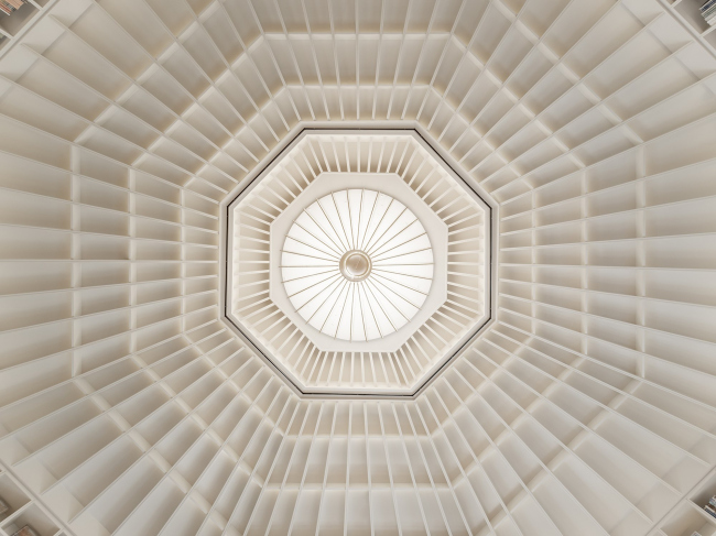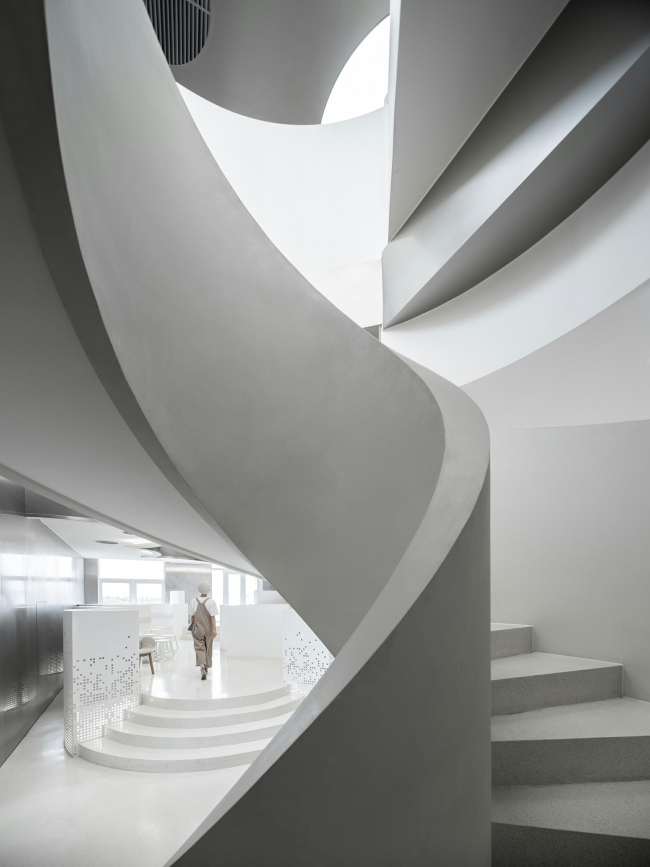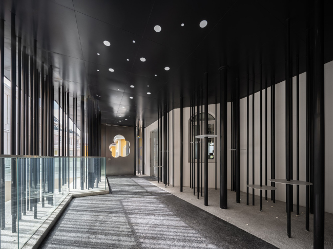 Коридор ведет в кафе «Облачная терраса»: по замыслу авторов, у проходящего мимо столиков гостя должно создаваться впечатление, что он идет сквозь облака. Подиумы и подвесные конструкции обеспечивают визуальную многослойность, а сочетание белоснежных панелей из алюминия и серебристых матовых – из нержавеющей стали – придает помещению одновременно сюрреалистичную и спокойную атмосферу.