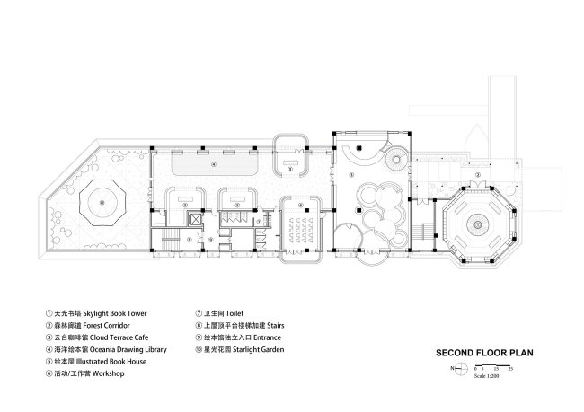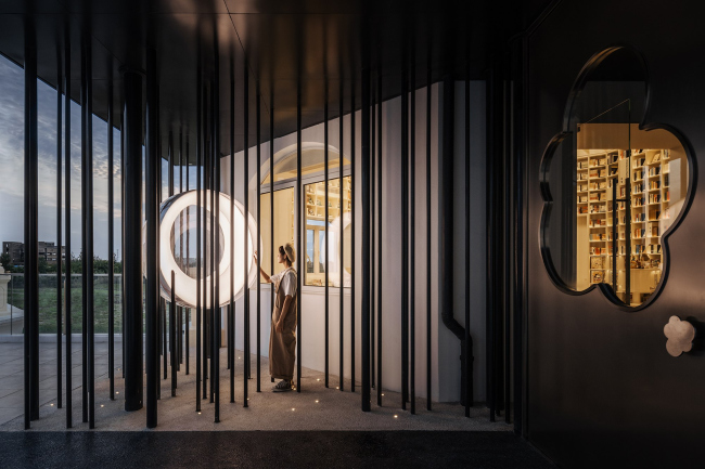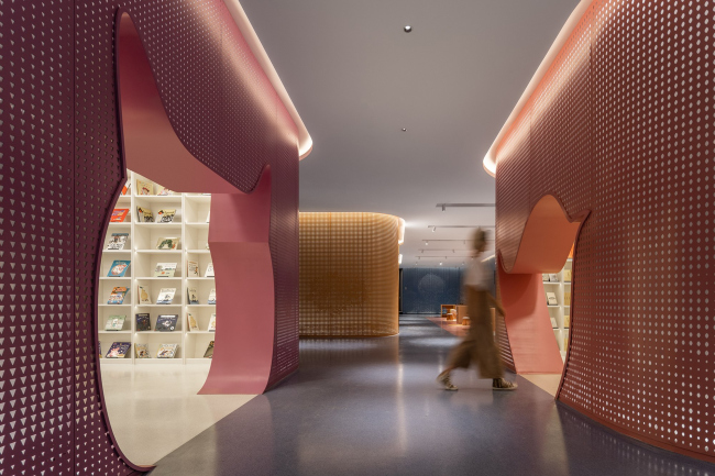 В конце маршрута «путешественника» ждет главная торговая зона, поделенная на несколько отдельных точек – каждая промаркирована своим цветом. Входы в книжные лавки отмечены силуэтами животных – представителей царства рыб, земноводных, птиц и млекопитающих. Аналогичный объем с проемом в виде птички вынесен на фасад здания.Книжный магазин «Доюнь» в ЯньчэнеФото © CreatAR Images