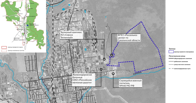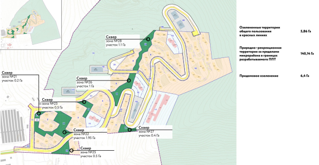 Зеленый каркас микрорайона соединяется с лесными тропинками и маршрутами, которые ведут к сопкам, водопадам, рекам и другим природным достопримечательностям. Выйдя из дома на прогулку через десять минут можно оказаться в красивейшем и довольно диком лесу. Жителям города такой вид досуга близок: здесь любят хайкинг, походы и горные лыжи. Отсутствие крупных общественных объектов в микрорайоне компенсируется «коммерческим контуром» первых этажей домов и объясняется масштабом Южно-Сахалинска: до аэропорта, который располагается на противоположном конце города, можно доехать за 30 минут. Кроме того, комплекс безусловно даст импульс к развитию соседних районов. Кроме того, в соответствии с генпланом города на прилегающей территории будет реализован масштабный инвестиционный проект «Агропарк» и появятся рекреационные зоны, что позволит говорить о новом полифункциональном центре города с рабочими местами и точками притяжения. Микрорайон УЮН© Институт генплана Москвы, ПИК-Проект