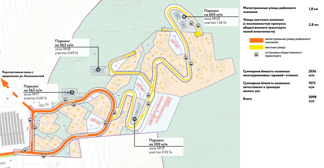 Все ярусы связывает дорога-серпантин, вдоль которой авторы проекта располагают многоуровневые гаражи – подземные парковки в условиях такого рельефа и гидрологии строить было бы нецелесообразно дорого. Учитывая высокий уровень автомобилизации Южно-Сахалинска, где на семью зачастую приходится по два автомобиля – для города и пересеченной местности, а также ограниченное количество открытых парковочных мест, гаражи будут пользоваться спросом у будущих резидентов. Для удобства жителей остановки общественного транспорта также предусмотрены и расположены на комфортном расстоянии.