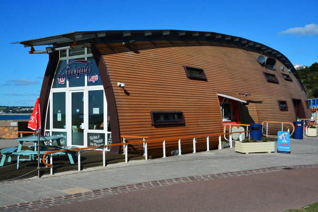 В облике 33-метрового «Фрегата» прослеживается характерная для работ Уилла Олсопа жизнерадостная тональность: в объем заложен образ морского судна (хотя критики утверждали, что здание больше похоже на беременного броненосца или кита, выбросившегося на берег), прямоугольные оконные проемы хаотично «разбросаны» на фасадах, а кровля имеет панорамное остекление, что в сочетании с высокими стенами превращает кафе в подобие морского дна.