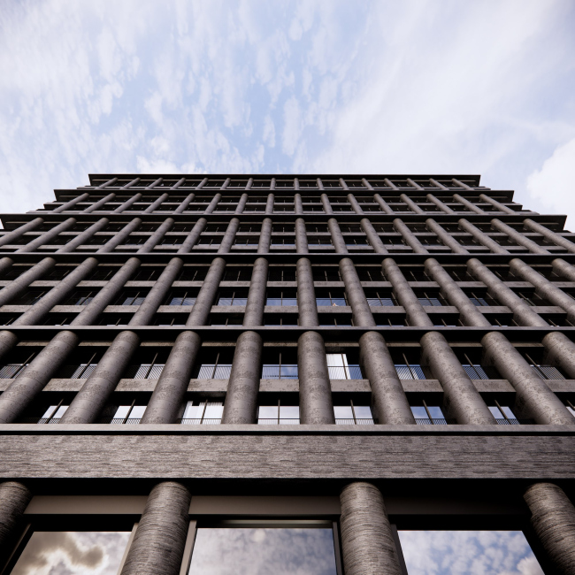 Очень сильным впечатлением стал проект ЖК «Рассвет» Kleinewelt Architekten. Сбитые ритмы угольных столбов, тяжко шагающих, то сплоченных, то будто бы чуть расступающихся, поблескивая призрачной надеждой. Мог ли вообразить себе столь сумрачные зори итальянец Гуэррини?