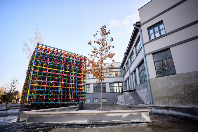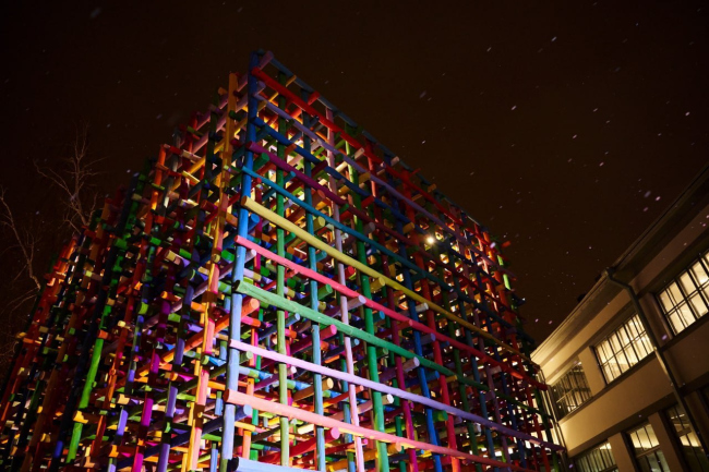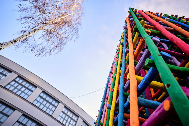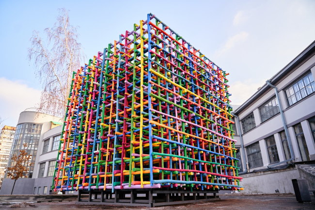 Николай Полисский «Супрематический куб» размером 7х7х7 метров насквозь пронизан цветом. И мы даже не сразу видим, что в нём находится. У куба шесть плоскостей, и в него можно вглядываться бесконечно, ведь под воздействием солнца или сложного искусственного освещения, цвет словно вырывается изнутри, и арт-объект кажется изменчивым. «Супрематический куб» будет все время преображаться: форма находится в своем первозданном виде, а цвет всегда различается. Суперматический куб Николая Полисского в СамареФотография © Евгений Шаров