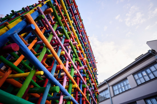Скульптура привлекает яркостью. Концептуально это переведенный в объем квадрат Казимира Малевича. Полисский играет с восприятием зрителя: срез бревна издали смотрится как красочное пятно на картине, а неровные древесные поверхности выглядят как экспрессивные мазки импрессионистов.