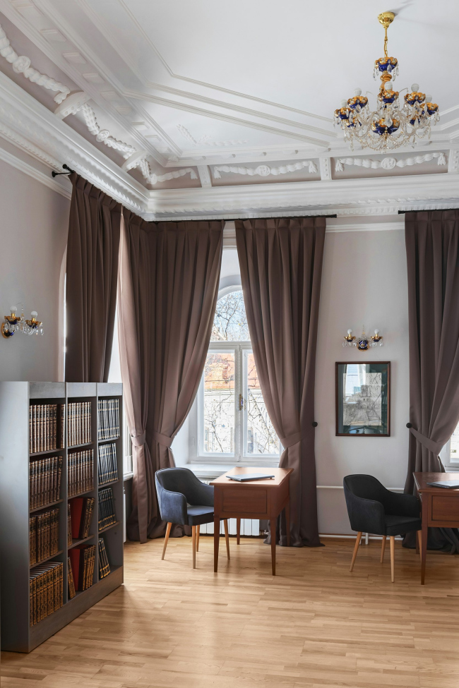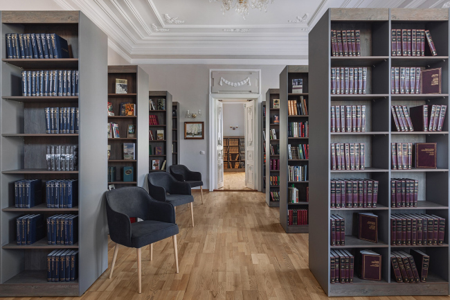 Поскольку здание является памятником архитектуры и менять что-либо глобально было нельзя, архитекторы обходились малыми средствами: перекрасили стены, освободили от стеллажей окна, украшенные лепниной, наполнили пространство естественным светом. Далее, придерживаясь рамок бюджета, запроектировали новые столы и стеллажи, подобрали из возможного ассортимента стулья.