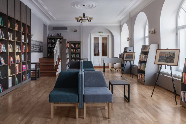 Модернизация библиотеки в Енисейске, расположенной в купеческом доме XIX века, позволила внутренним пространствам соответствовать архитектуре здания. Небольшой бюджет заставил искать творческие решения: мебель сделана по эскизам архитекторов, стены украшают картины местных художников, а зонирование учитывает многоуровневое устройство здания.