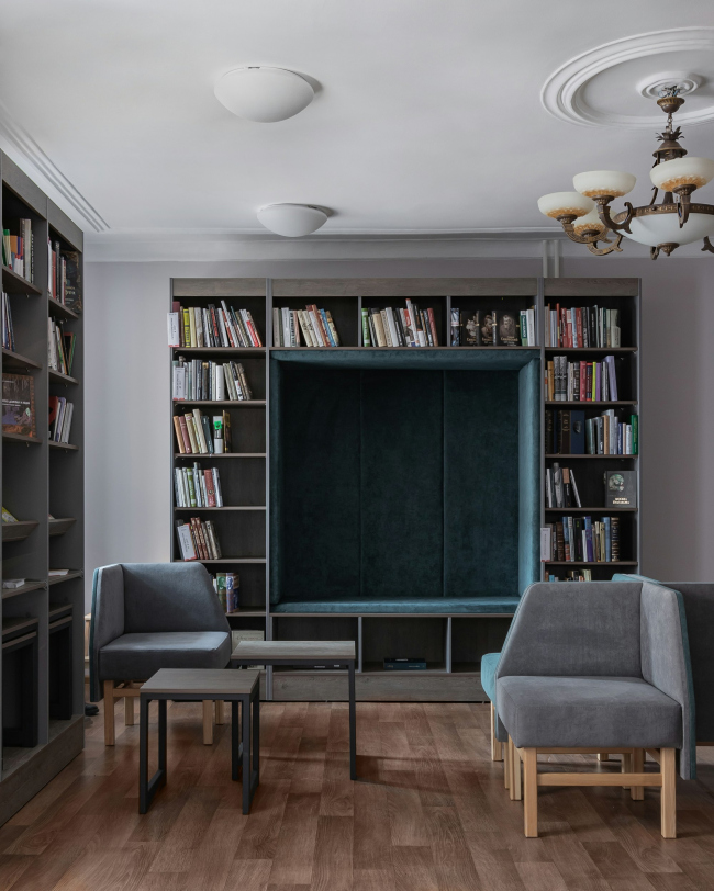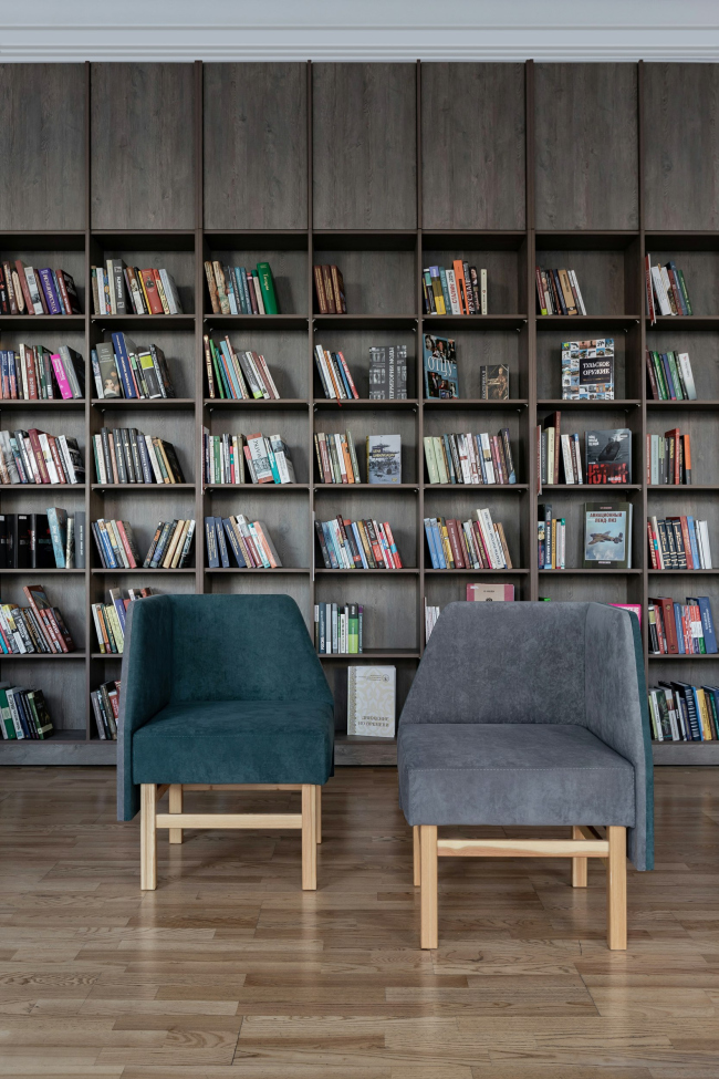 Дальний каминный зал архитекторы определили для одиночной тихой работы, в проходные помещения добавили функции для командной работы и сформировали проходы стеллажами. Также предусмотрены места для молодежи с неформальными и удобными местами для чтения.