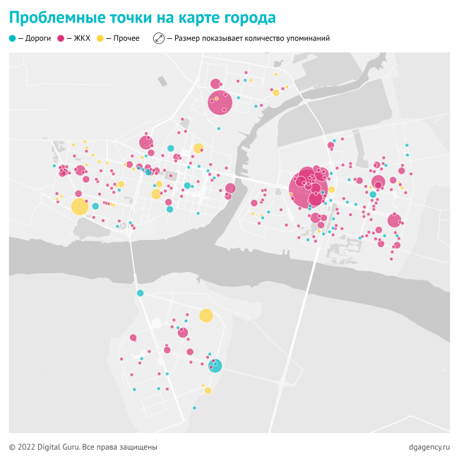 Чтобы изучить отношение горожан к благоустройству и городскому развитию, агентство проанализировало почти 115 тысяч сообщений в городских пабликах от местного населения в соцсетях. Жители активно обсуждали новые городские проекты, высказывая в том числе и критические замечания. Отдельно жители выделяли вопросы вырубки или сохранения зеленых зон в городе. На основе аналитики были определены и наиболее проблемные места и районы, где жители чаще всего жаловались на проблемы существующей инфраструктуры – коммунального хозяйства, состояния дорог и текущего благоустройства.