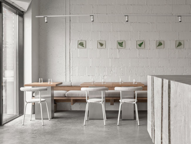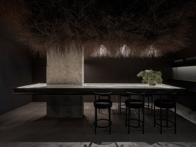 Дневной зал навевает ассоциации с опушкой леса, где видно, как меж стволов высоких сосен падают солнечные лучи, а ноги утопают в ковре мха. Один из главных элементов – бетонная барная стойка с «следами» природы: перед заливкой архитекторы поместили в опалубку ветки деревьев, благодаря чему получили выразительные отпечатки. Стены украшают залитые в эпоксидную смолу листья папоротников из местных лесов.