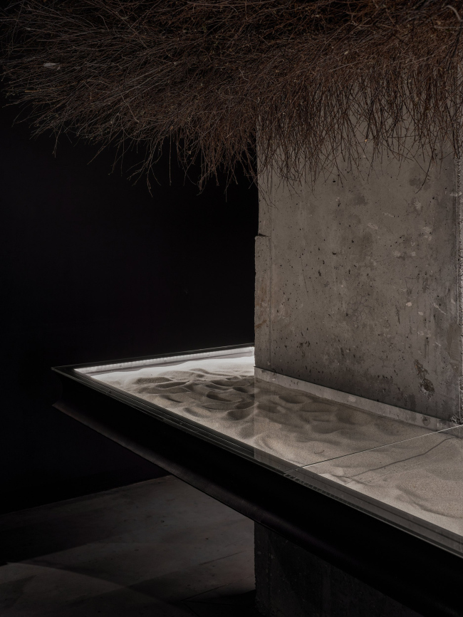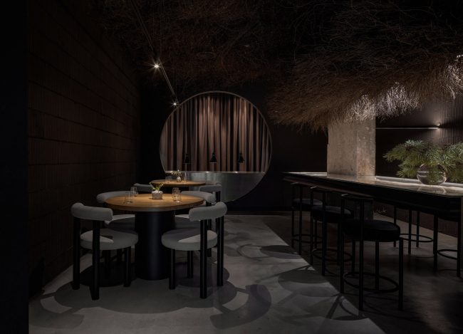 Гастробар «Ветви»Фотография © Мельников Сергей / предоставлена LINE DESIGNГастробар «Ветви»Фотография © Мельников Сергей / предоставлена LINE DESIGN Второй зал, олицетворяющий густой лес, окутанный мраком, больше подходит для ужинов. Он также контактирует с кухней, жизнь которой посетителям приоткрывает большое круглое окно: сразу за ним расположен стол, на котором сервируют блюда. Темный зал украшает светильник из веток, скрывающий конструкции потолка, а также большой консольный стол, заполненный песком Балтийского моря.