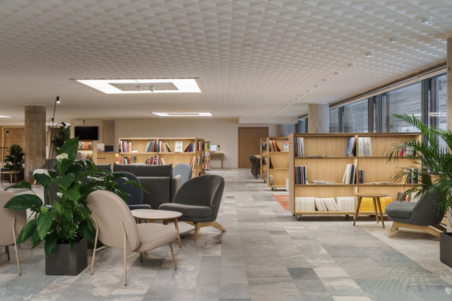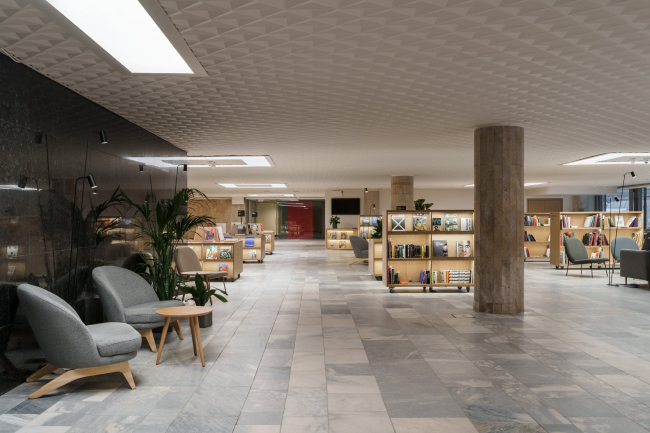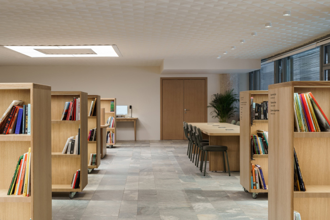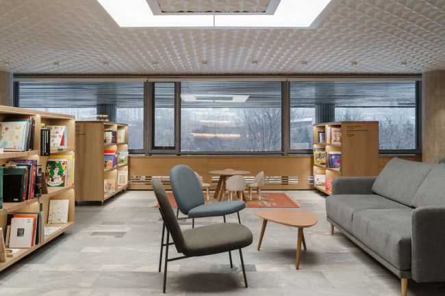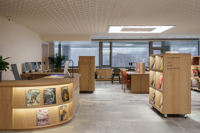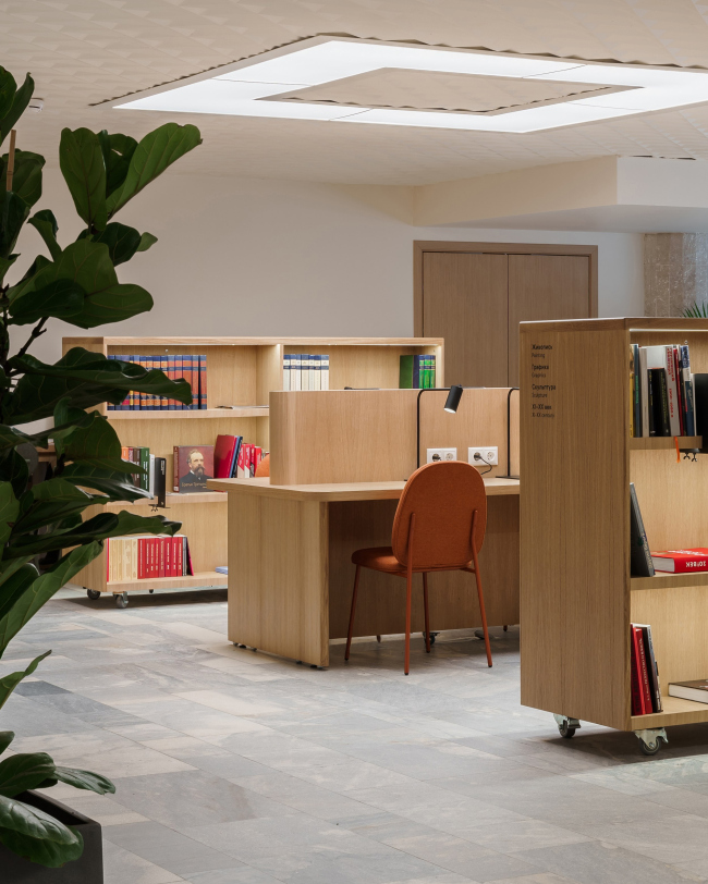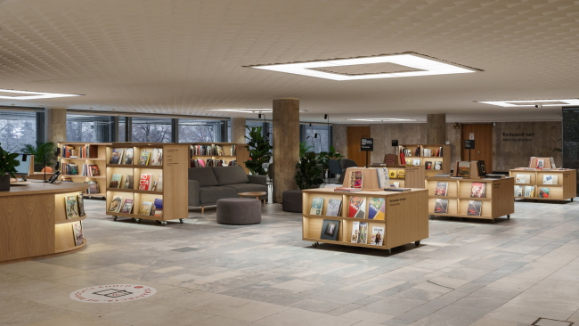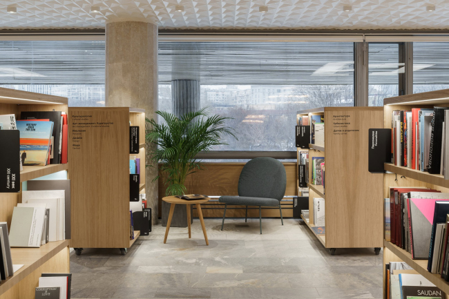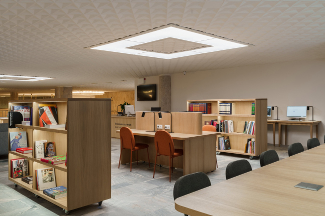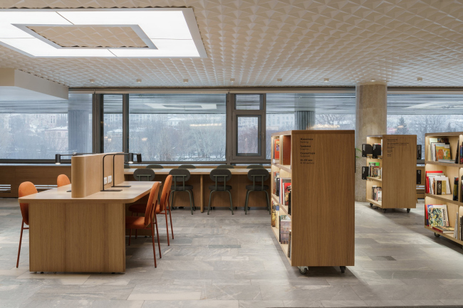 Основная «единица зонирования» – книжные стеллажи. Их небольшая высота позволяет сохранять зрительный контакт между библиотекарем и посетителями. Выкладка книг меняется с лицевой на корешковую в зависимости от рабочей зоны и типа книг. Вся тяжелая мебель, за исключением кафедры, снабжена колесиками: при необходимости ее можно перевезти в техническое помещение на временное хранение и использовать фойе для больших мероприятий. Стулья и некоторые кресла заказали у петербургской мастерской delo design.