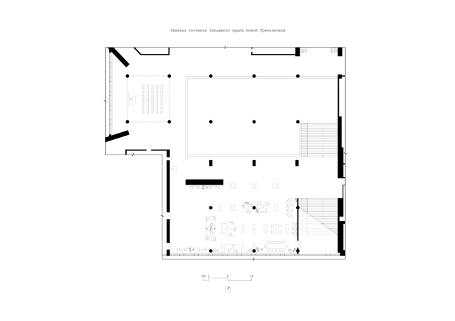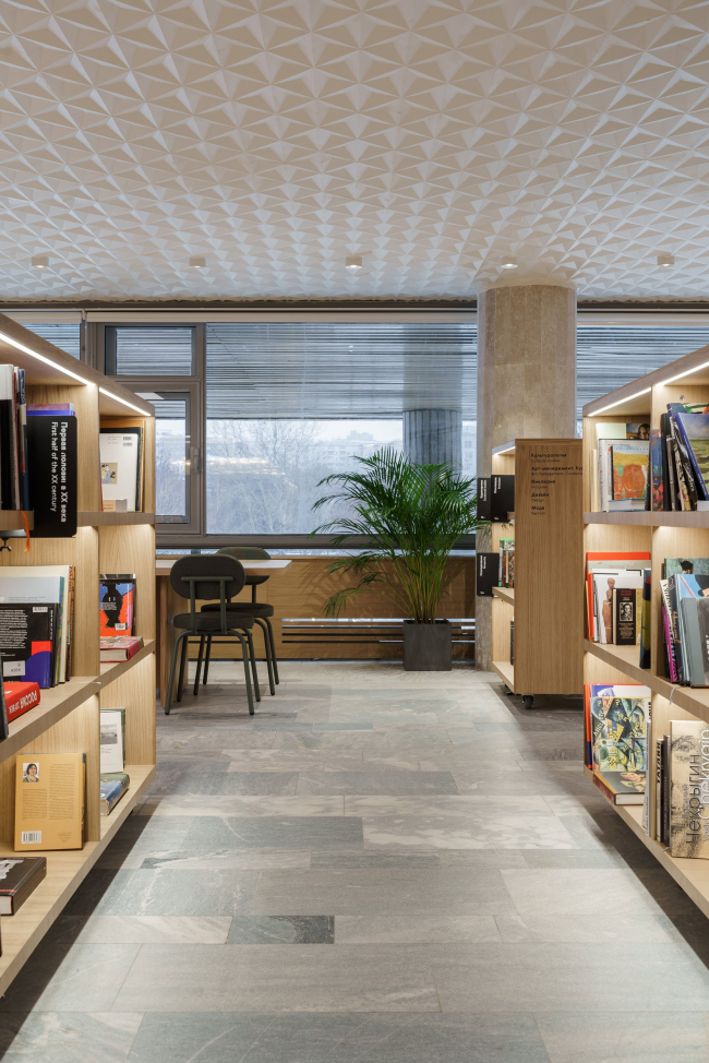 Бюро «Хора» уже работало с Третьяковской галереей в 2018 году, обновляя экскурсионное бюро и сувенирный магазин. Также в портфолио команды есть два других «книжных» проекта – павильон в парке «Кузьминки» и для библиотеки Некрасова. Оба они выполнены в соответствии с «Концепцией стилистических решений для Московских библиотек», которую архитекторы сами же и . В случае Третьяковки бюро «Хора» старалось соотносить проект с историческими интерьерами бывшего Киноконцертного зала ЦДХ, но делать это не слишком прямолинейно.