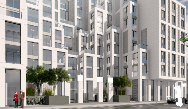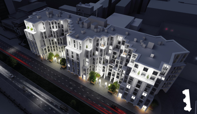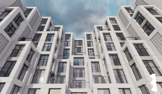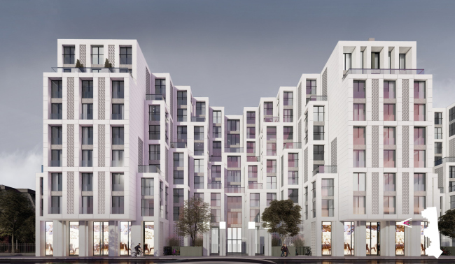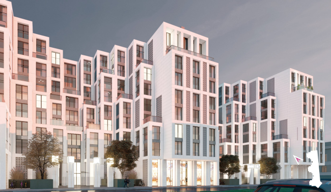 Высота дома «Студии 44» – 28,33 м. Чтобы избежать ощущения монолитной стены, архитекторы «распластывают», по их выражению, масштабное здание с помощью трех ризалитов и нарастающих объемов террас. В облицовке предполагается использовать светлый архитектурный бетон и фиброцементные панели, которые более устойчивы к загрязнению, чем натуральный камень.